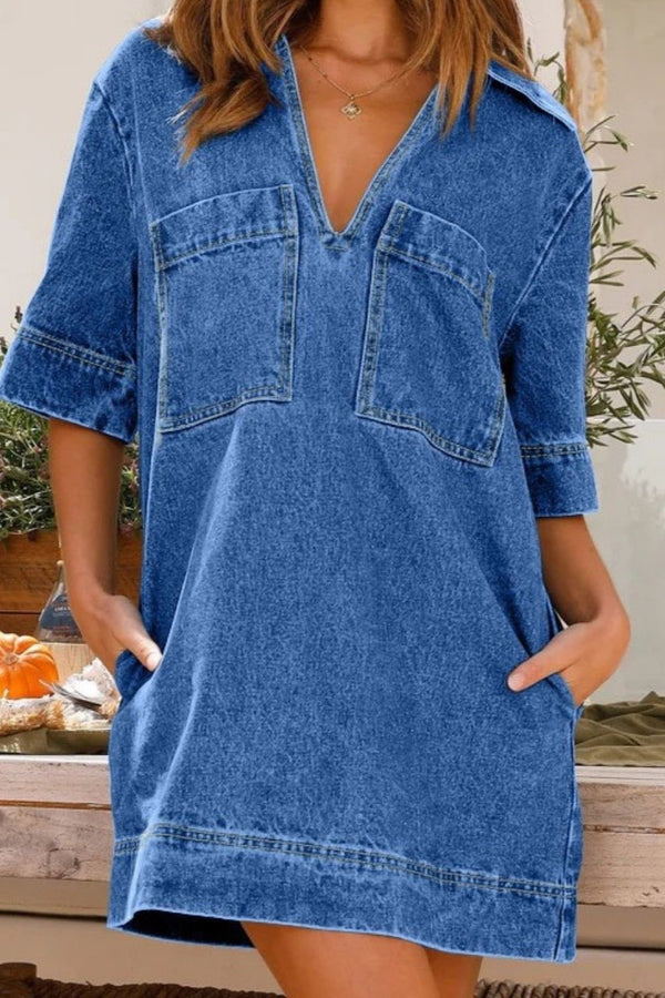 Introducing the versatile and stylish Anna Short Sleeve Denim Dress! Featuring a classic collar, dress pockets and short sleeves, this dress can be dressed up or down for any occasion. The v neck adds a touch of femininity to this...