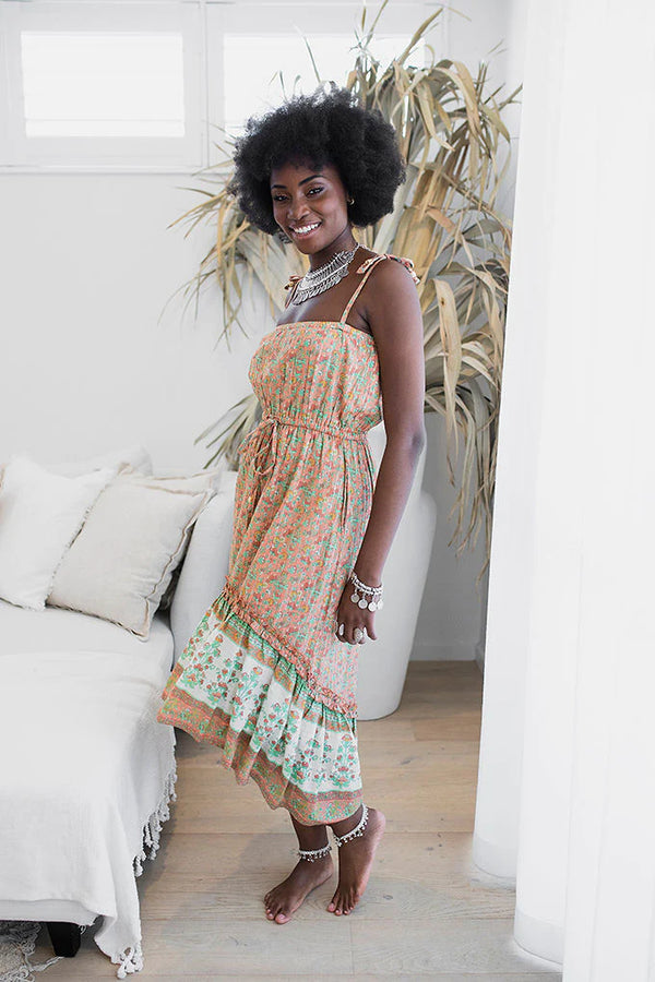 Our dreamy new Flowering Maxi Dress is so elegant on and comfortable to wear, with its voluminous Hilo hemline it creates the perfect boho silhouette. Featuring adjustable straps and a soft elasticated waist with tie detail, has the Flowering Meadows...