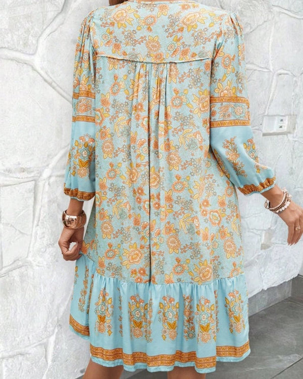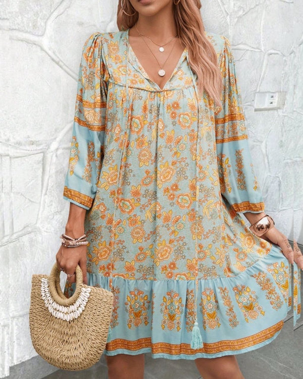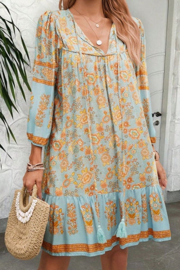 Infuse some boho vibes into your wardrobe with the Tiffany Floral Print Dress! Featuring a relaxed fit and a tie-neck adorned with playful tassels, this mini dress will surely make a statement. With 3/4 sleeves and a wide hem, it's...
